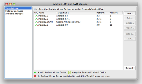 Next, select “Window -> Android SDK and AVD Manager”. In the resulting dialog, select “Virtual Devices” from the left panel and click the “New…” button.