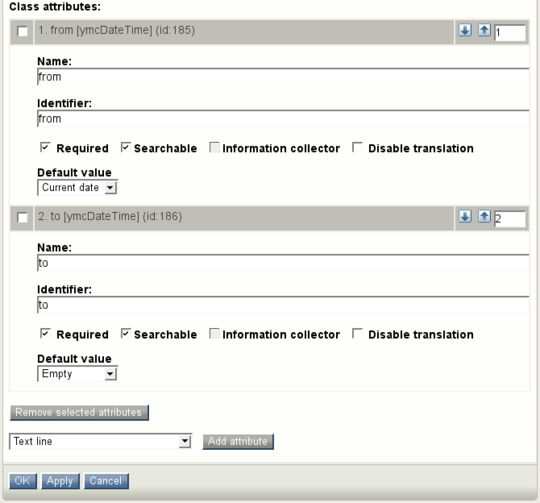 Recall the previous screenshot showing the Object Edit Interface for two attributes using the “ymcdatetime” datatype. The screenshot below shows the Class Edit Interface for the content class with the same two attributes.