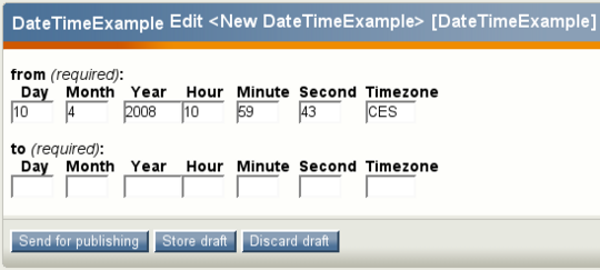 Both of the attributes in the screenshot have seven input fields, representing the different elements of a point in time. These input fields are not saved separately inside our content class, but represented in attributes as single DateTime objects.