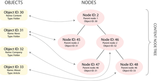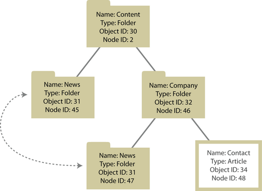 Nodes are organized in a node tree, storing all published content in a hierarchy. A node provides a location for a content object within the tree structure, and refers to exactly one content object. However, an object can be referenced by several nodes, thereby appearing at multiple places in the node tree. The following illustrations show an example of a structure where an object (with an ID of 31) has multiple locations in the tree.
