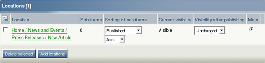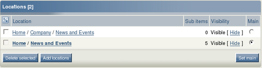 The currently selected node is displayed using bold characters. The location itself, shown as the actual node path, can be used to access higher nodes in the content hierarchy. The radio button on the right indicates whether the node is the main node. If the content object is published at only one location, this will always be the main location. It is possible to add and remove locations using the Add locations and Delete selected buttons. The Set main button is used to change the main node.