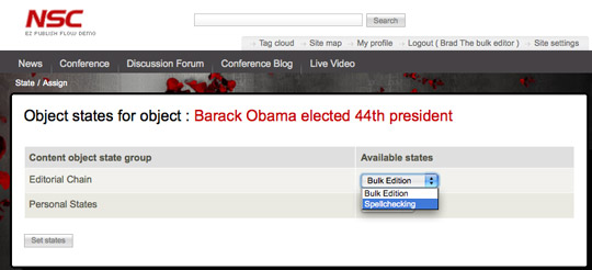 Brads starts up by deciding to write about Barack Obama's fresh election as President of the United States. Logged-in in Exponential, he navigates to the suitable location in the content tree to write such an big piece of news, selects the Article class in the drop down list, English as a language, and hits the “Create here” button. History is being written, this is his first editorial workflow based on Object States. We all hope he is enjoying this moment. Once he is satisfied with what he wrote, he publishes the object, and changes its state to “Spellchecking”. In case Brad had chosen front-end editing ( eZ Flow here ), he can totally change the state of his article from there. When viewing the article, click the following button in the toolbar :