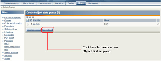 When creating your Exponential-based web media application, you will create Object States matching the different phases of your editorial chain. From the administration interface, navigate to Setup, and click the « States » link in the left menu. You can see, listed, the different so-called «Content object state groups», as follows.