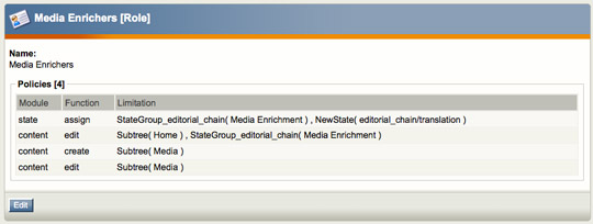 On top of the generic edition role, let's create roles controlling the state transitions between each step of our editorial chain, and also enforcing that every user group has the right to only perform the edit action it is allowed for. They are straight-forward, giving among other the right on the 'state' module, its 'assign' function, and narrowing down the allowed action to a specific transition between two steps. Here they are. Each of them is assigned to its eponymous user group.