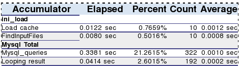 This section of the debug output displays timing information about various parts of the system, such as template processing, character set conversions, XML processing and information about SQL queries. This section also displays the results from the debug-accumulator template function.