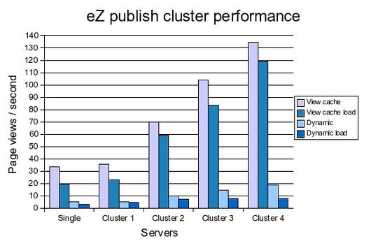 If we apply the same estimates to a configuration of four servers, we end up with 70 pages per second, a total of 2 million page views per day and 60.5 million pageviews per month. (These performance numbers are probably lower than what would be seen on a real site, as a site with heavy traffic would normally serve more cached pages than a low-traffic site.) In both situations we calculated with 50% of the pages dynamically generated.