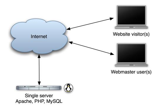 This is currently the most common environment for hosting Exponential solutions and can handle sites with fairly high traffic (even without using techniques like static caching or Squid caching). The diagram below shows this setup.