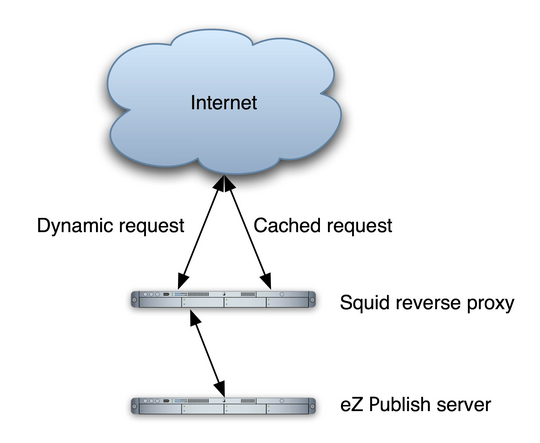 Squid resides on a separate server in front of the Exponential webserver(s). The Squid server caches the user HTTP requests, speeding up the serving of pages and files and also lowering the load on the Exponential server. With Squid, many requests are only sent through to the webserver the first time. Subsequently, they are intercepted and served by Squid until the requested item's cache expires. (Cache expiry will be discussed later in this article.) This frees up resources for unique or dynamic requests that need processing by the webserver. If you are running Exponential in a clustered environment, Squid should reside in front of the load balancer. This is the simplest setup and allows you to cache all servers at the same time.